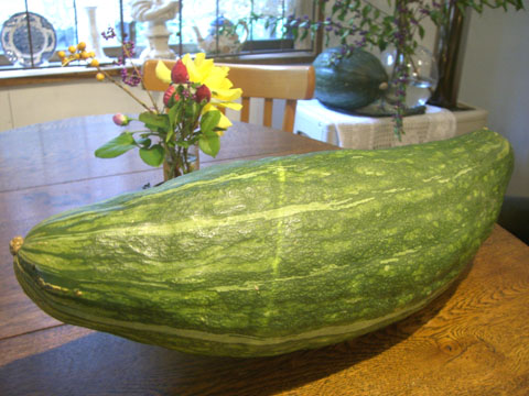 1枚目の写真の後ろにもかぼちゃ。こちらは九重という品種です。ラグビーボールみたい。何に生まれ変わるのかこうご期待。