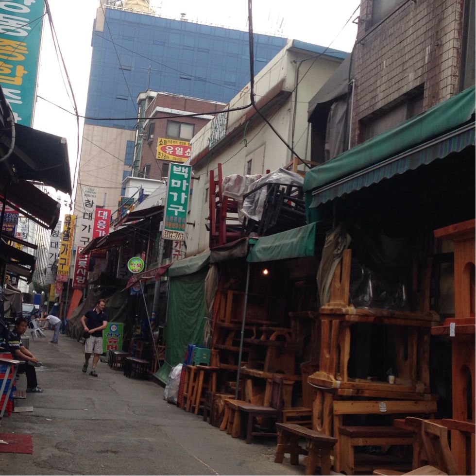 先程の橋を渡るあたりは沢山のホルモン屋さんが道脇でテーブル出しています。アルミの上で焼いているのであまったらお持ち帰りできるみたいです。本当に沢山の店があるので全部は見れません。気がつくと新堂駅まで来ていました。この駅の付近には市場やトッポギ タウンがありますよ。この辺りは人と神の境界線なんだそう。そんな事も調べて歩くともっと楽しそうでした。