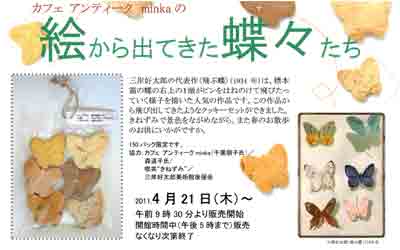 この4月21日より発売でご近所の三岸美術館でミンカでスィーツを作らせていただきました。1934年の三岸の作品”飛ぶ蝶”よりクッキーをやきました。ドライトマトやパンプキン等の味がたのしめます。使っている食材は野菜から育てたものもはいっています。体に優しい原料の選びとなっております。まだ雪が降っている札幌ですが(今日も吹雪、昨日も青空の中に吹雪の時間が! 春はもうすぐ、ガンバロ!)このクッキーが発売のころはすっかり雪も解けていて欲しいものです。こちらはカフェ担当の千葉さんが手作りしております。絵心のある千葉さんのクッキーどうぞ召し上がれ!