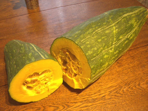 調べてみたら、「ほどよいあまみ・硬さがあり、炒め物・焼き物等にも向きます。通常のかぼちゃの2倍程食べる部分がある。味は甘く、栗のようなホクホク感がある。」